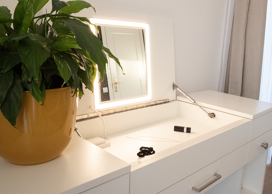 Laua keskmises ülemises paneelis on peidus peegel, mida ümbritseb led-riba. See on dimmerdatav (puutetundlik lüliti laua sees), nii et valgust saab sättida vastavalt vajadusele.